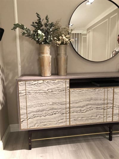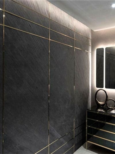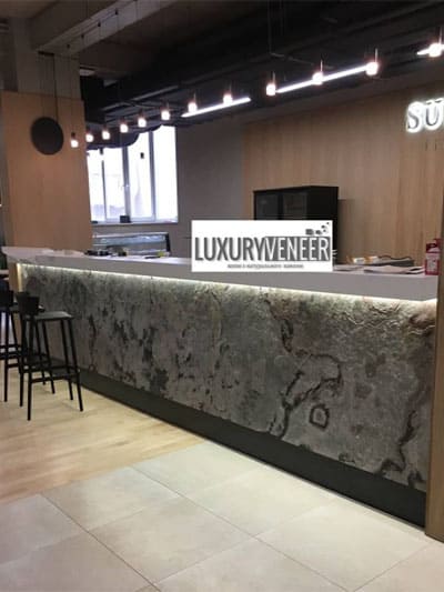 Применение каменного шпона возможно в любом месте где вы захотите, например настенные покрытия, камины, ванные комнаты, мебель.